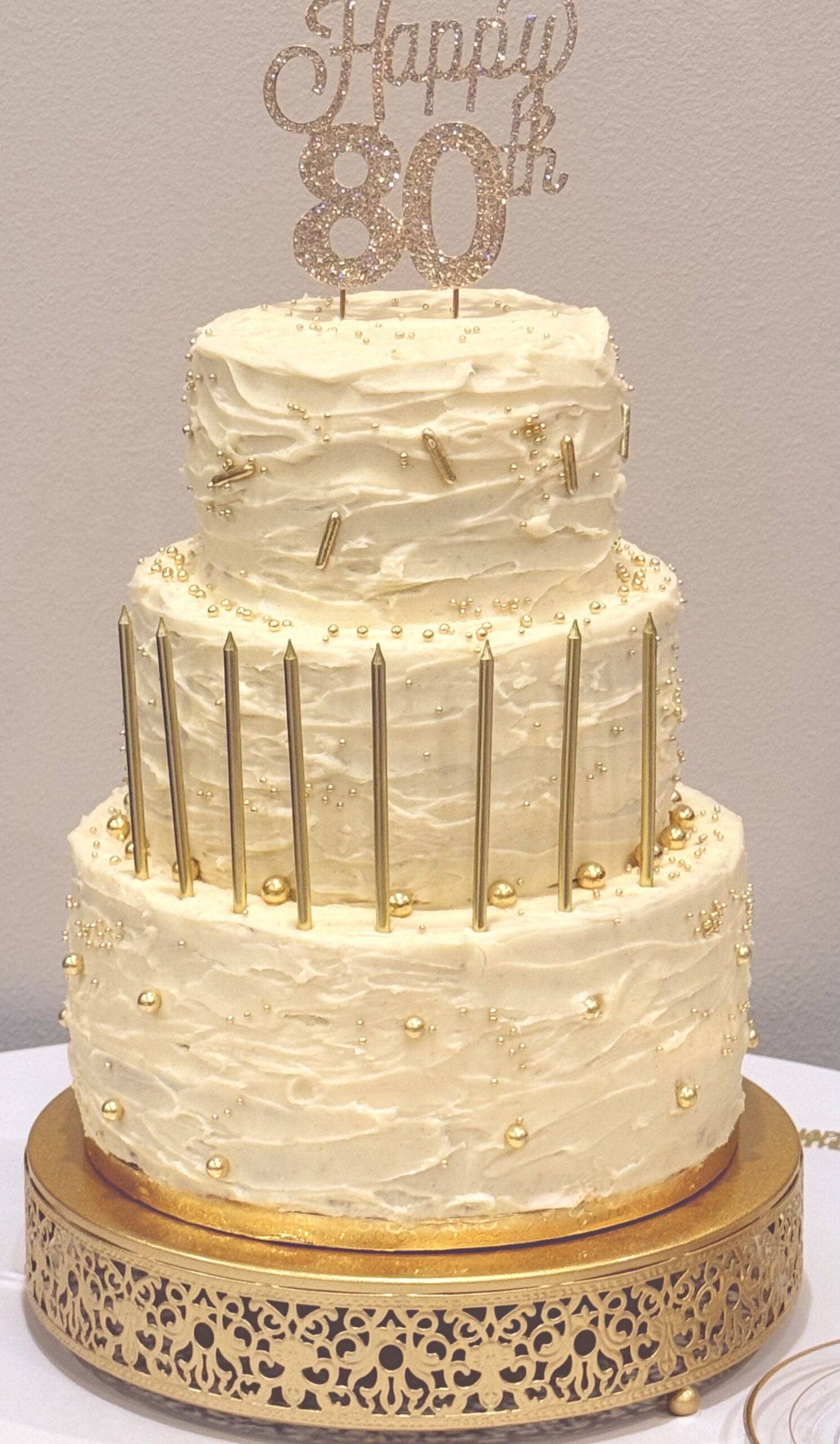 3 Tier 6, 8, 10 inch Butter Pecan Cake with Cream Cheese Frosting. Decorated with gold beading.